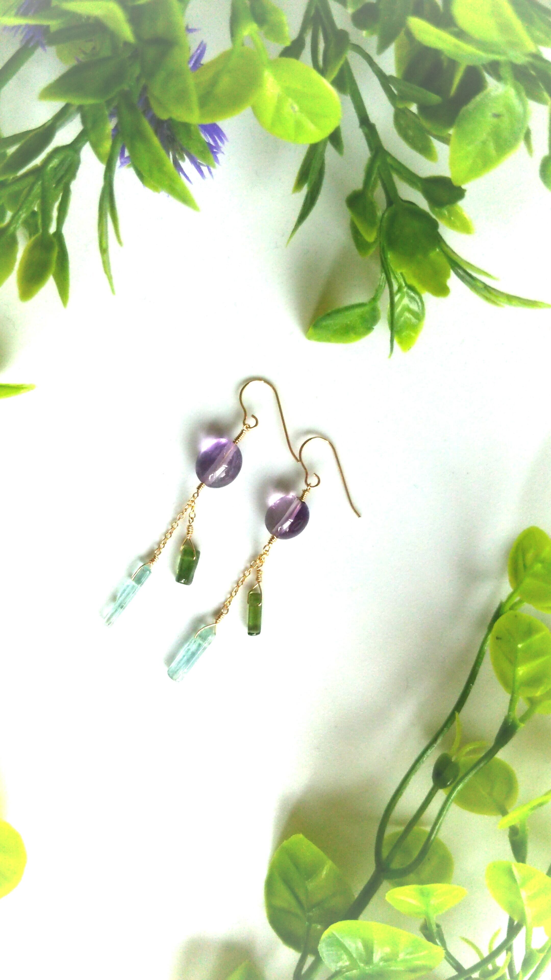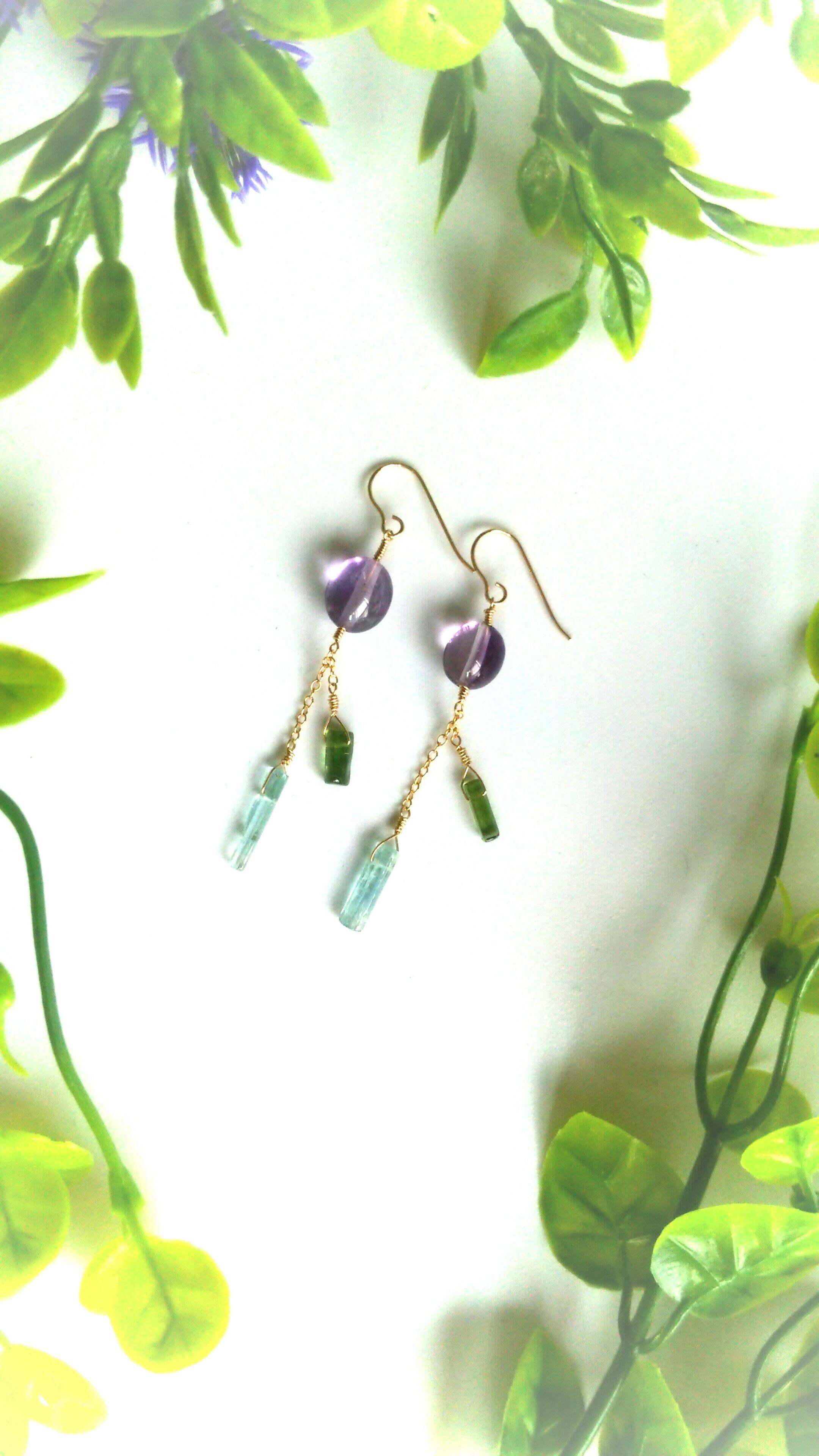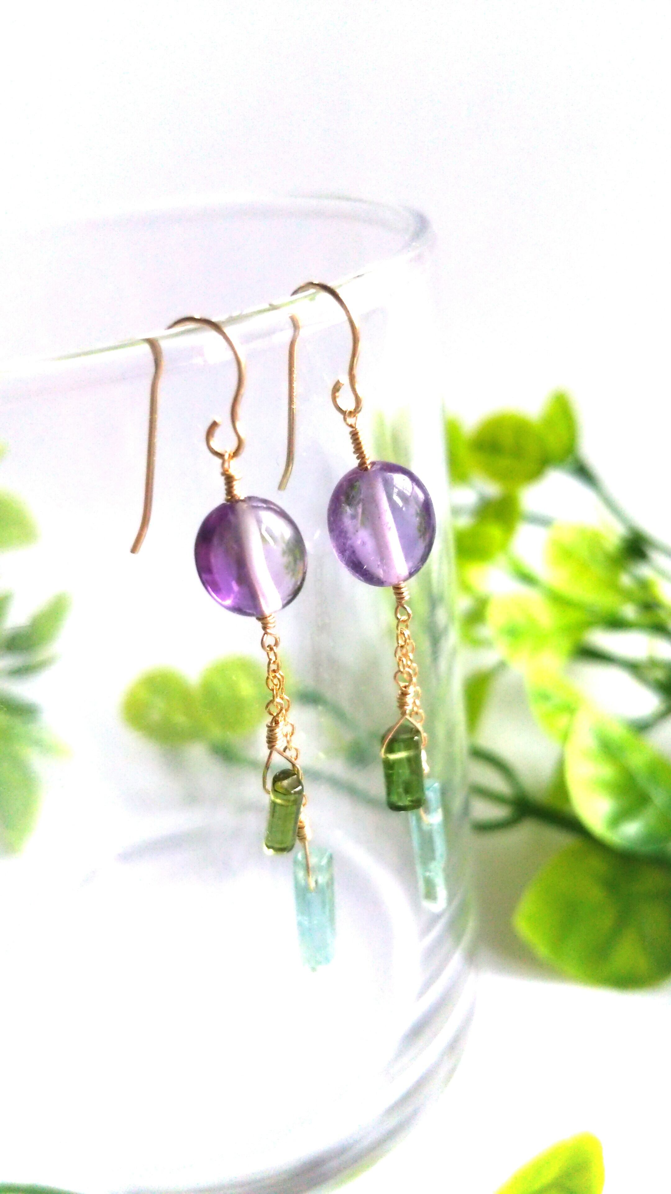 コロンとまあるいライトカラーのアメジストにスティック状のトルマリンを風鈴を模して揺れるようにあしらいました。