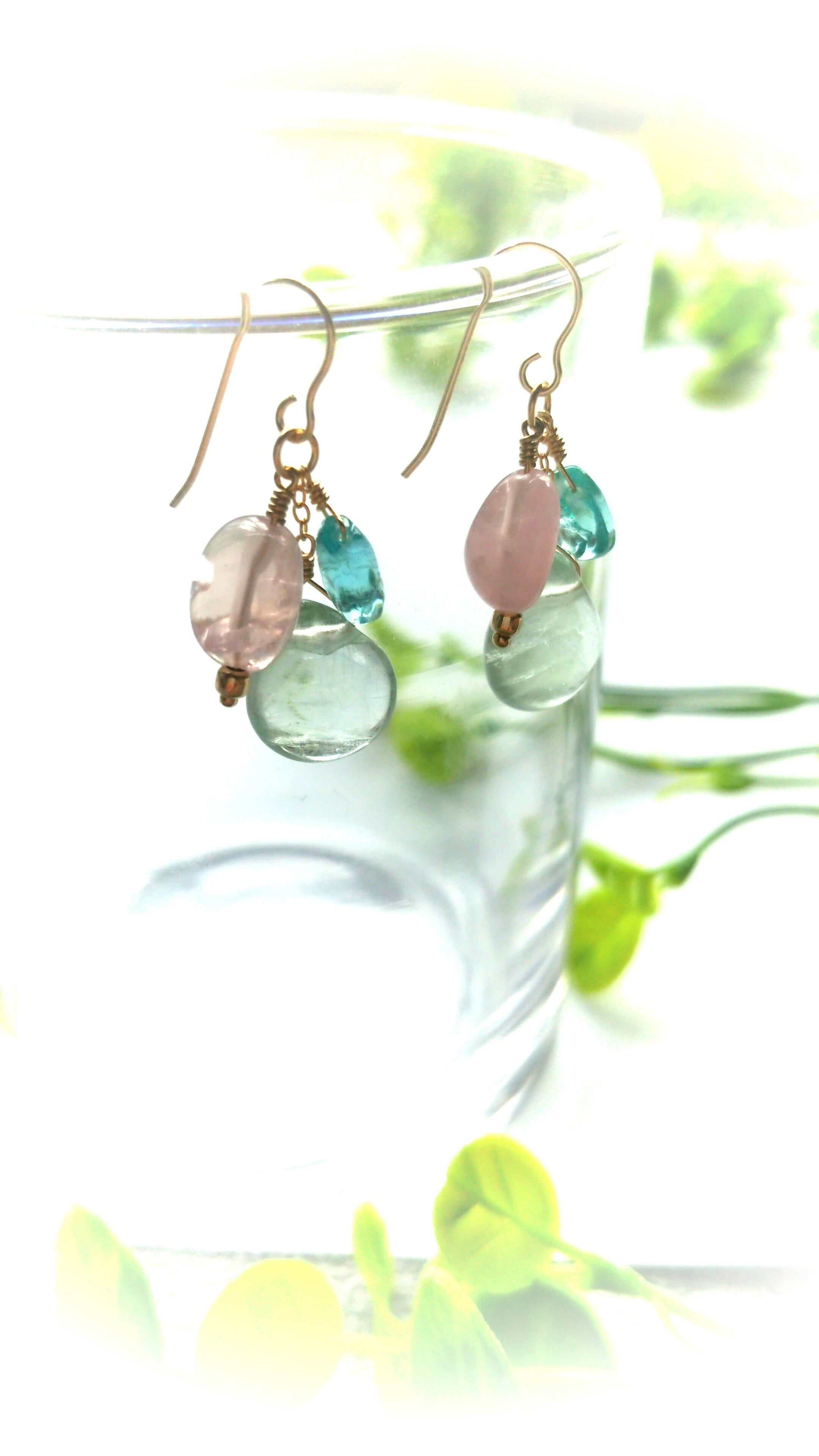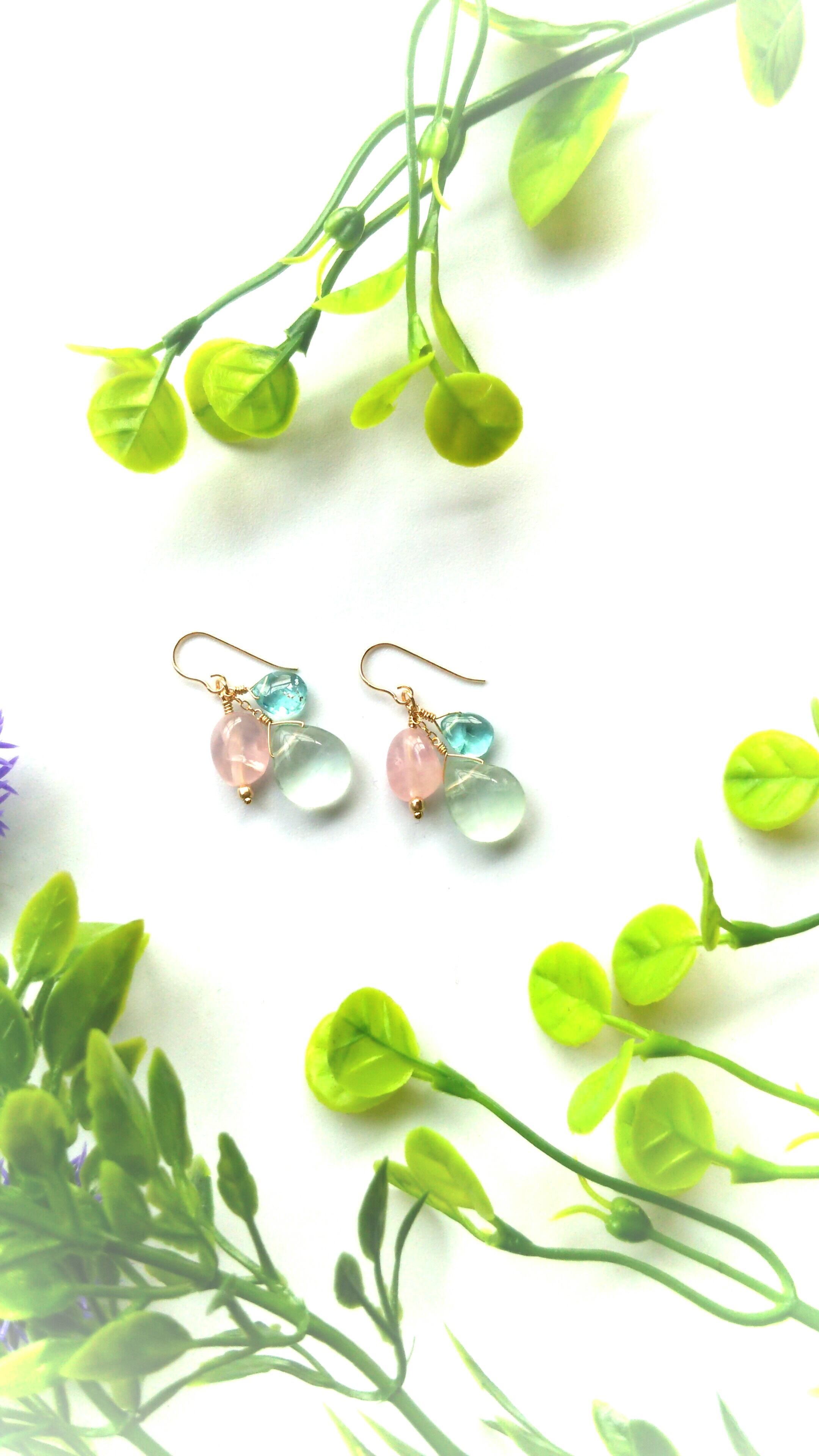 プレーンなドロップカットのグリーンがかったライトブルーフローライトに透き通るブルーが美しいアパタイト、優しい色合いのローズクォーツを合わせて夢可愛いピアスにしたてました。