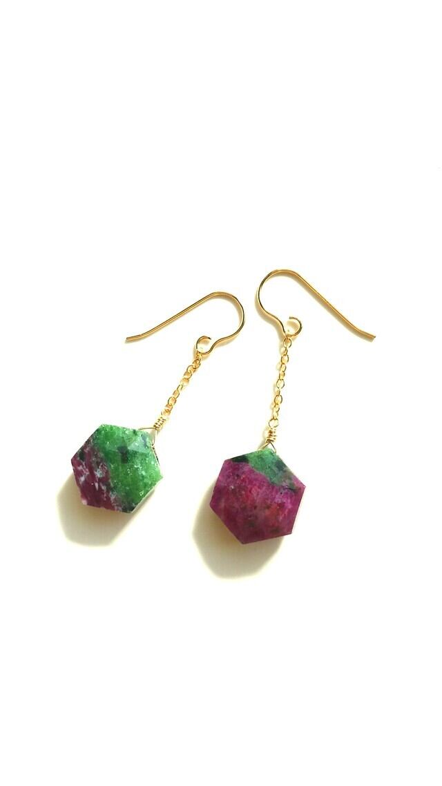 グリーンにワインのような色のルビーのコントラストが美しいルビーインゾイサイドをシンプルに一粒仕立てのピアスにしました。